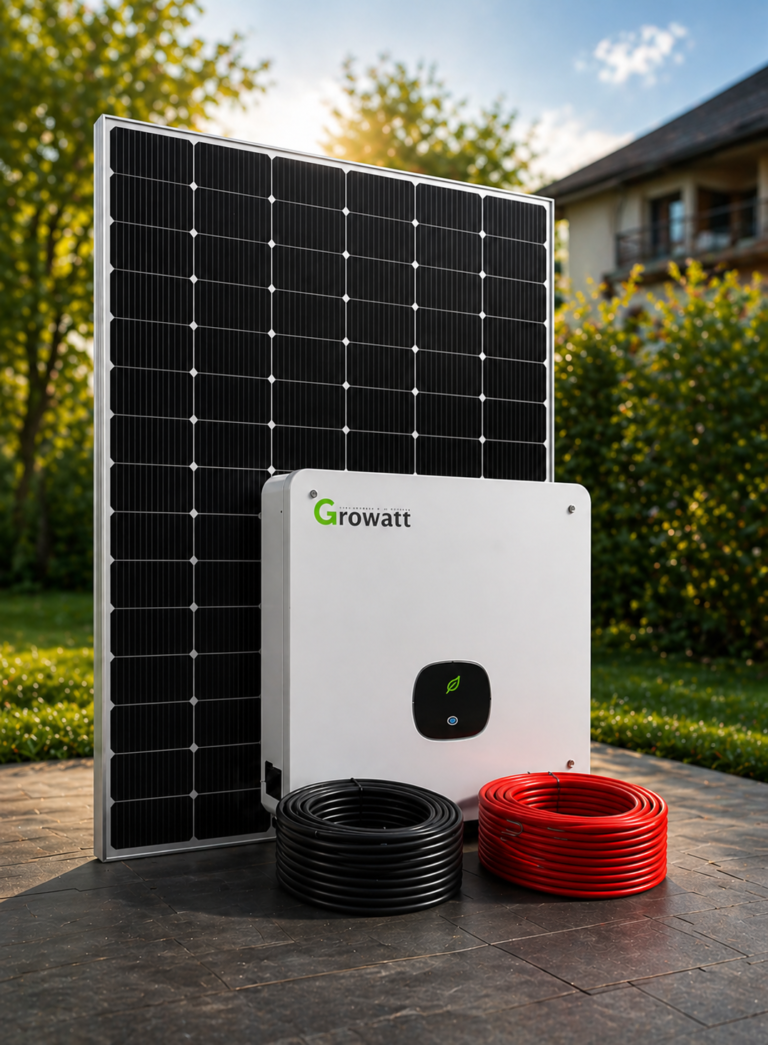 Kompletny zestaw fotowoltaiczny zawiera wszystkie elementy niezbędne do uruchomienia instalacji produkującej energię elektryczną ze słońca. W jego skład wchodzą panele fotowoltaiczne oraz inwerter (falownik) – on-grid, off-grid lub hybrydowy.